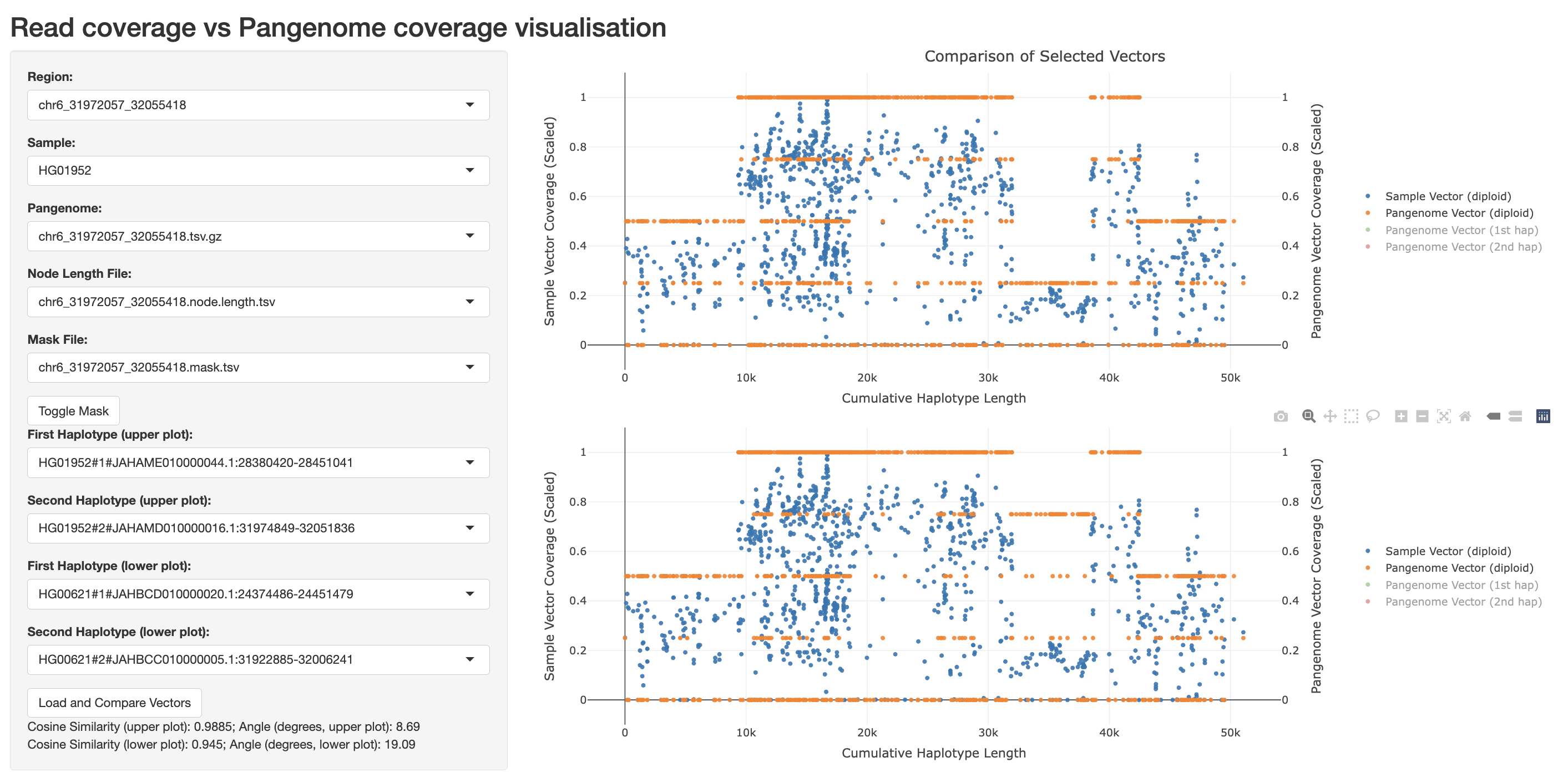 The app primarily visualizes short-read coverage (Sample Vector Coverage, blue dots, left y-axis) versus haplotype coverage (Pangenome Vector Coverage, orange dots, right y-axis) across graph nodes (Cumulative Haplotype Length, x-axis). Each dot represents a graph node, and the Cumulative Haplotype Length accounts for the length of each node.