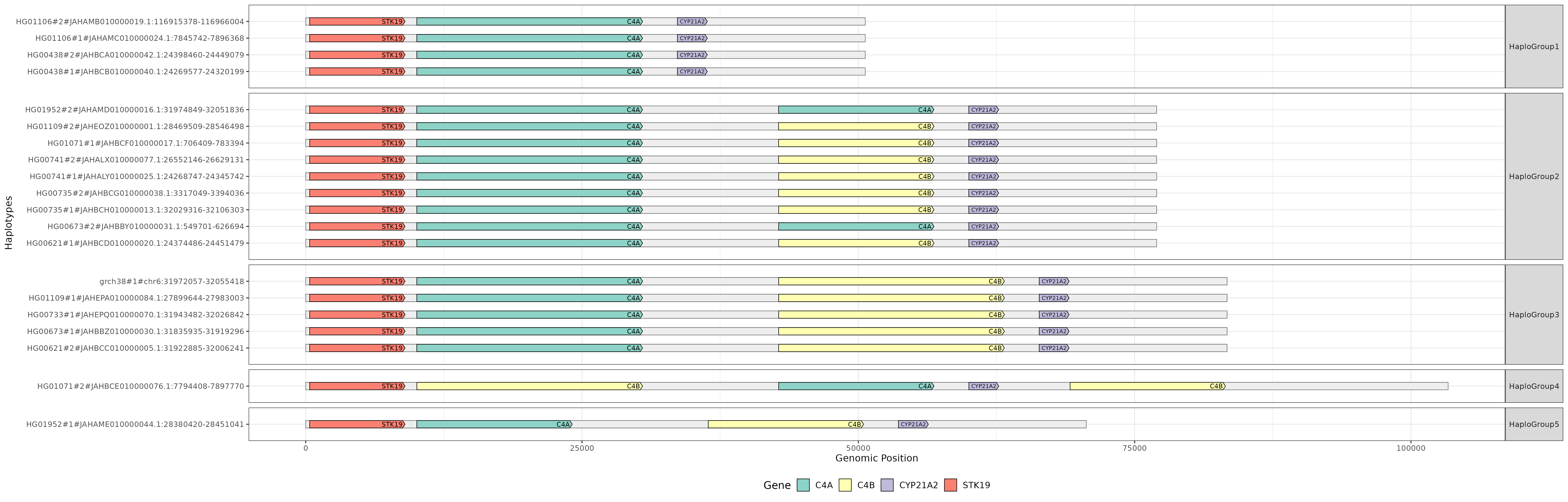 If gene annotations and protein sequences were provided, cosigt uses pangene to build gene graphs and project annotations onto the assemblies. An example visualization for the C4 locus: